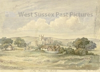 | Full description | St Mary's Parish Church, Littlehampton. Watercolour painting by Mrs W.E. Partridge. View across fields to the church and other buildings with thatched roofing. Trees. Dated 12 September 1841 on the bottom right corner. |