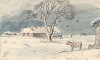 | Full description | Old Erringham Farm, Shoreham-by-Sea. Country scene showing cow in right foreground next to wall and hurdle, large tree in centre, farmhouse and farm buildings in background, small figures of men, a horse, carts and chickens in background. Painting by unknown artist. |